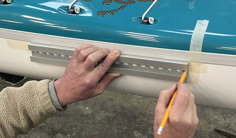 To fit the footrests in a boat, first work out where you want to fit them. On the outside of the boat, mark where you want the closest bolt to go through the hull. Place a bit of masking tape over the spot to steady the drill and using the correct bit size for the bolt drill through.